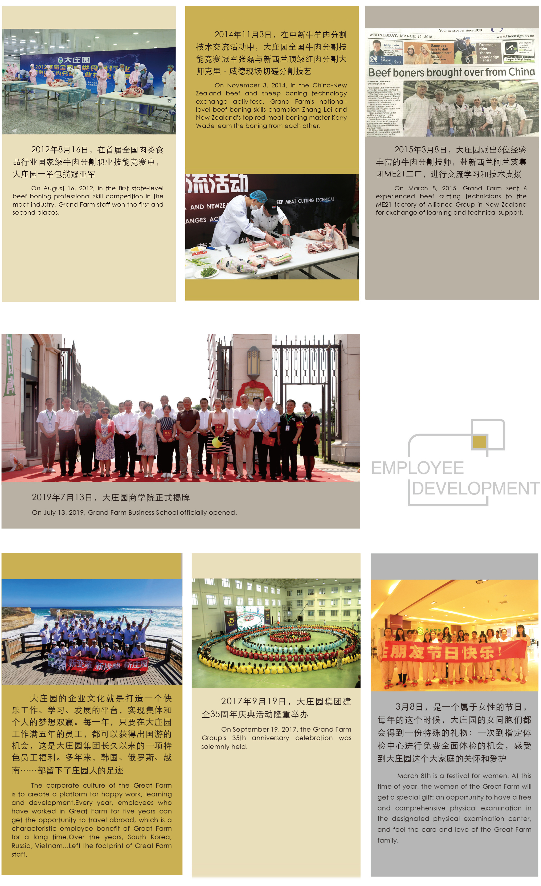Grand Farm pays high attention to the employee growth with enterprise development, taking it as one of the enterprise's missions. The key staffs from senior management will be sent to Tsinghua University for EMBA study, and the outstanding grass-roots employees will be sent abroad to learn and exchange beef and sheep boning techniques. In addition, Grand Farm Business School has been founded to develop a training system which integrates individual and team learning with strategic research. Recreation and vocational training activities are also conducted for employees.